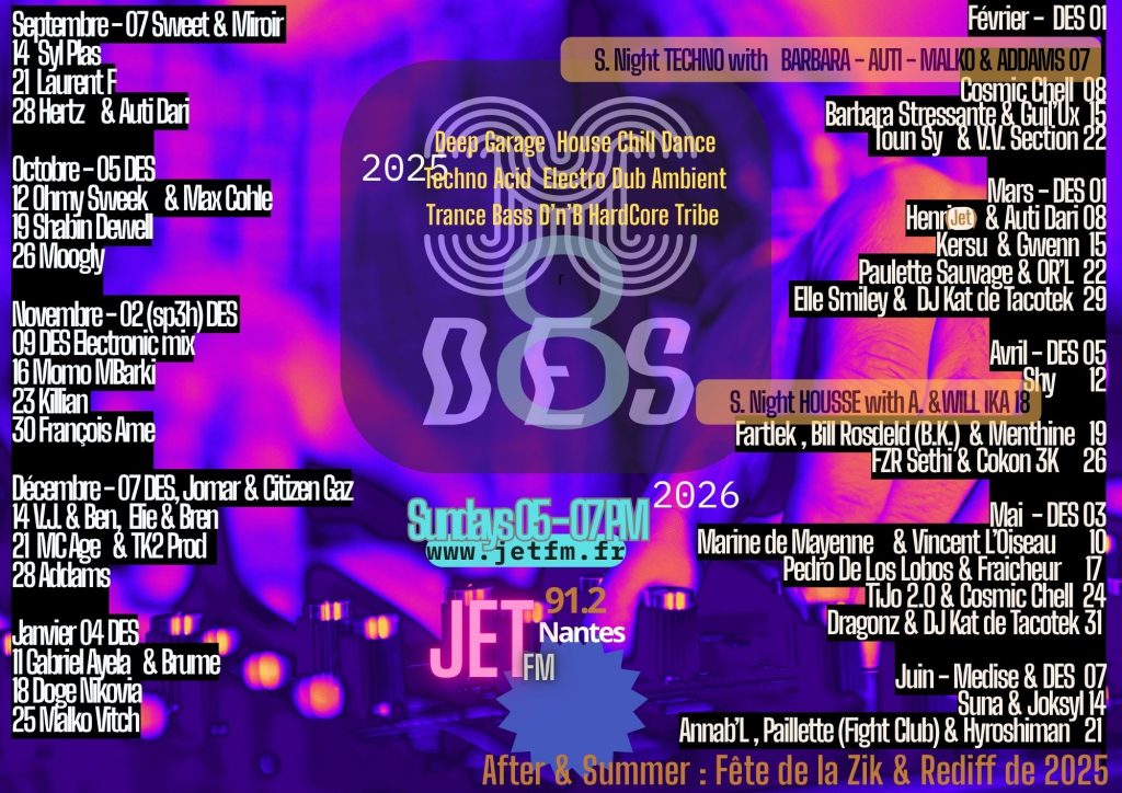 - 05.12.2025 Private night pour l’anniversaire d’un ami ! Au rendez-vous, des Djs du côté de la techno avec des pointures de l’époque. Et D.E.S. y jouera pour un set très spécial que je rediffuserai lors d’une furue émission !