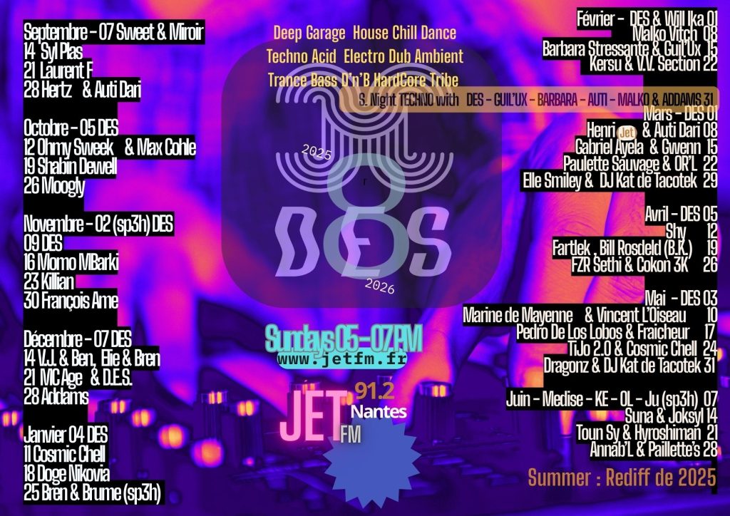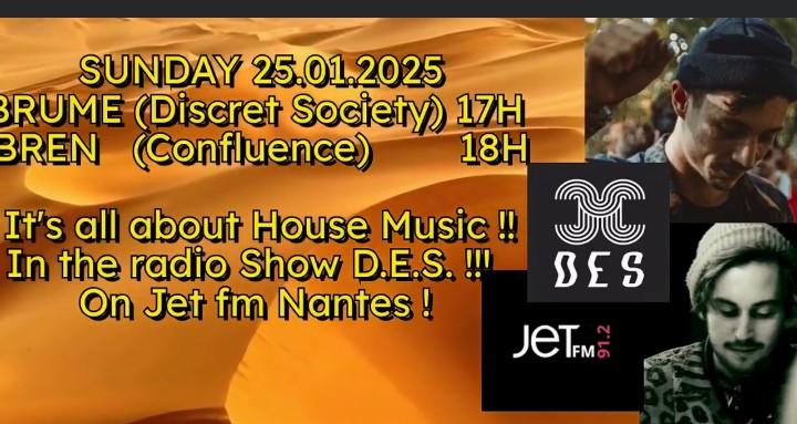 09.01.2026 _ Cosmic Chell . De son vrai prénom Cédric , est Dj depuis bien bien longtemps . Il a collectionné depuis plus de 30 ans des disques vinyles ! Une folle collection il a acquis au fil du temps ! Cet amoureux de musique Electronique a son pêché-mignon : la musique Disco ! Et il nous a justement envoyé sur cette session, des disques improbables & introuvables , collector quoi, de Disco Underground ! Avec un finish un poil Electro ! Clique sur Play et apprécie cette première session 2026 in D.E.S. ! Et meilleurs voeux !!!!!!18.01.2025 _ Doge Nikovia : Il est sur la scène nantaise avec ses mix de House, de Deep, d’Organic ! Il joue souvent au côté de Lily H , dans différents collectifs, et différents endroits, comme au Lieu Unique, à l’Agronaute et autres endroits. Je l’ai vu cet été à la Chaumière, c’était un super moment . Donc Doge c’est envoûtant, puis ça progresse pour te laisser aller sur le dancefloor. 2 heures de Doge, c’était le programme de ce dimanche a apprécier ici, en replay !!!25.01.2026 _ Brume & Bren . Deux noms qui se ressemblent , mais de 2 collectifs différents . La 1ere heure, c’était Brume, qui jouera d’ailleurs prochainement sur Nantes, à la Guiguette des Nantais , mais aussi à Module ce tout nouveau lieu festif nantais, et au Bar 303 ! Brume voulait jouer ses dernières trouvailles, aux sonorités techno & transy. Avec un petit souci technique, il nous a livré en live finalement un super mix ambient, down tempo, assez spirituel. Brume fait parti du collectif Discrete Society. Il est venu au studio, pour cette session : merci Simon ! Puis en 2e heure, nous sommes montés d’un cran, avec de la House bien pumpy ! Bren m’avait enregistré un dj set exclusif pour l’émission, de House UK, bass et bien groovy ! Bonne écoute , et régale toi !