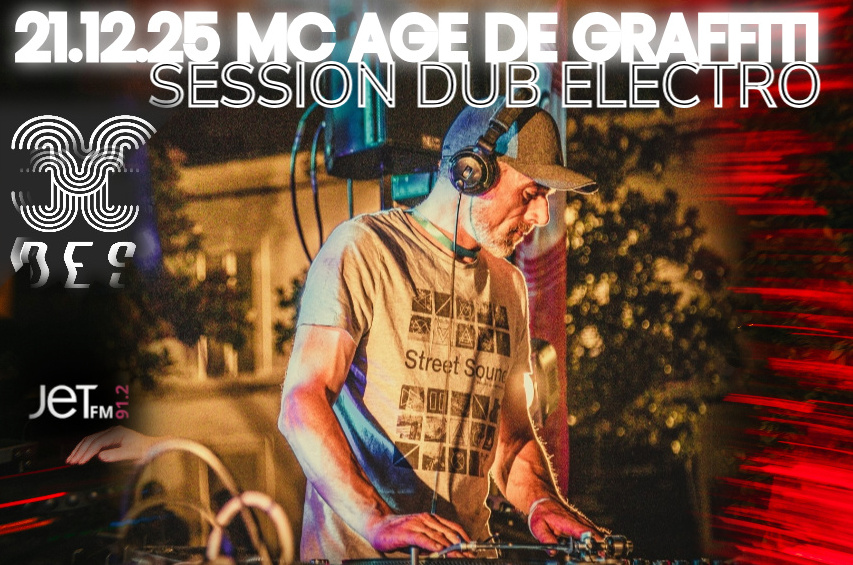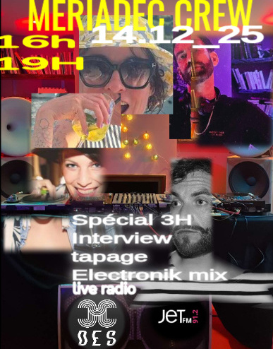 14.12.2025 _ Mériadec Crew par Virge ! Une bonne partie du Mériadec Crew était là au studio de Jet. Pour une session spéciale de 3H, car nous avons commencé à 16h ! Excellente ambiance, parsemée d’anecdotes, et nous en avons mieux su, sur le futur projet associatif du collectif nantais Mériadec, qui commencera en janvier. Avec une bonne sélecta d’Elie, bien 70S. Puis 2h de sons Electros se sont écoulées sur les ondes ! Virge, Lise & Ben ont évolués avec des sons bien lourds . L’équipe a mis le feu au studio. C’était chaud! You can to play here, for the sensation and the very good sound !! Thanks Mériadec !!!21.12.2025 _ MC Age de la radio Graffiti( basée à la Roche-sur-Yon) . Excellent , la radio Grafitti ! Ce dimanche, j’ai donc invité l’un des membres de cette excellente radio : MC Age ! Il m’a fait une bien bonne session Dubby ! Ici, on a kiffé. Du son bien cool, mais bien bon aussi ! Des basses qui raisonnent ; Du groove qui sillonne, façon Rastafariiiii !!! Puis j’ai continué la 2e heure, en mode Dub, Drum & MinimalTech ! 28.12.2025 _ Addams ! As-tu connu Check Point , c’était une émission sur Jet fm, et elle terminait bien souvent par des infoligne des teufs du Grand Ouest . Addams y a contribué . Nous étions en 98. Et bien l’invité de ce dimanche, c’était Addams. Il est venu au studio avec ses skeuds Techno ! Pour terminer 2025 en beauté! Du gros gros son techno, acid , et aux multiples couleurs . Mais pour certains, ça grattait bien du bon acid tribeu et j’en passe, avec des represses en vinyles des labels des Spirales. Addams a envoyé du très lourd ! Et bon réveillon à toi Auditeur !!!!