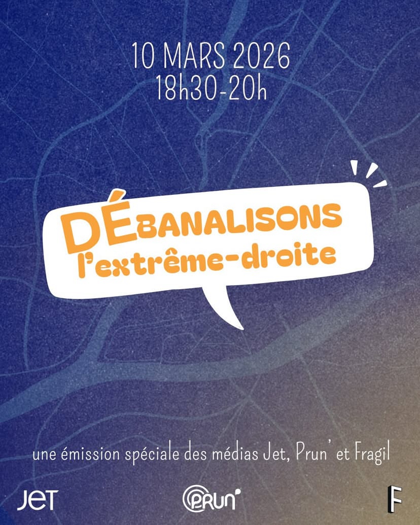 Sur les ondes de Prun’ et JET de 18h30 à 20h, “DÉbanalisons l’extrême droite”, une émission décryptage de la banalisation des discours et actions de l’extrême droite.