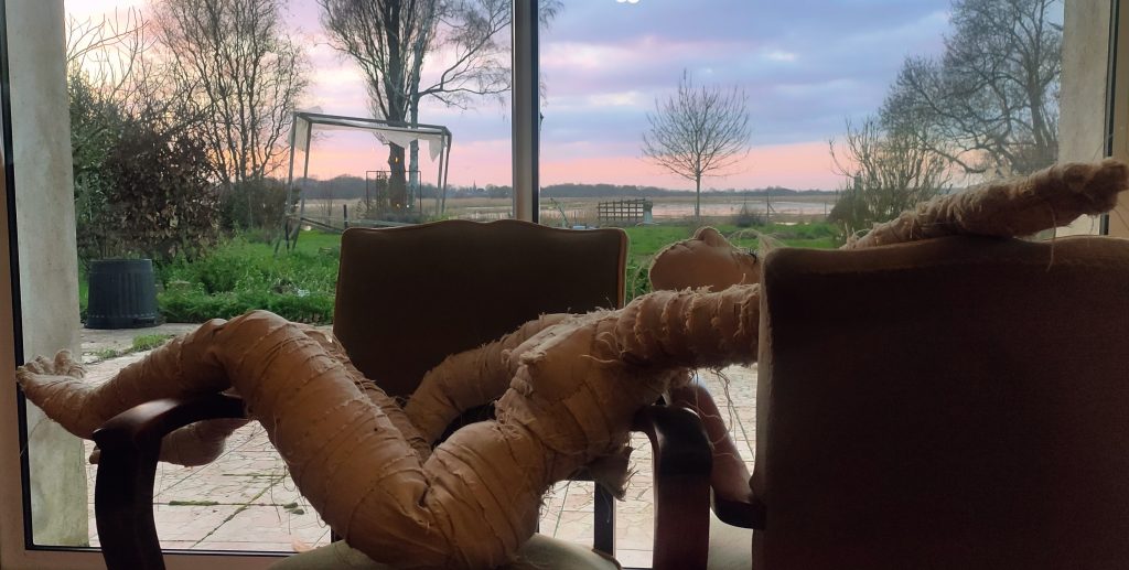 photo; Art textile de Terry Curling qui se repose sur l’île d’Errand de Saint-Malo-de-Guersac, chez famille Fallot